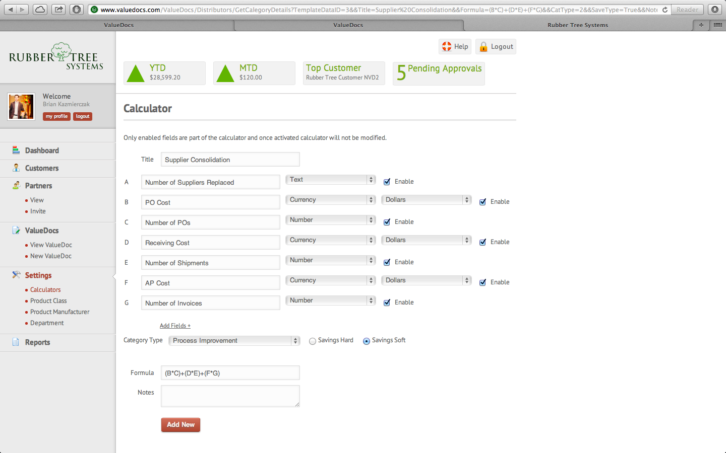 Under the settings option, choose Calculators. Build a calculator based on a value add service or product your provide. For example, price to price product savings, longer life product savings, vendor managed inventory, consignment inventory, etc.. You choose the fields, formula and savings type. Once your calculator has been verified, click the gray circle to activate it for your users.
